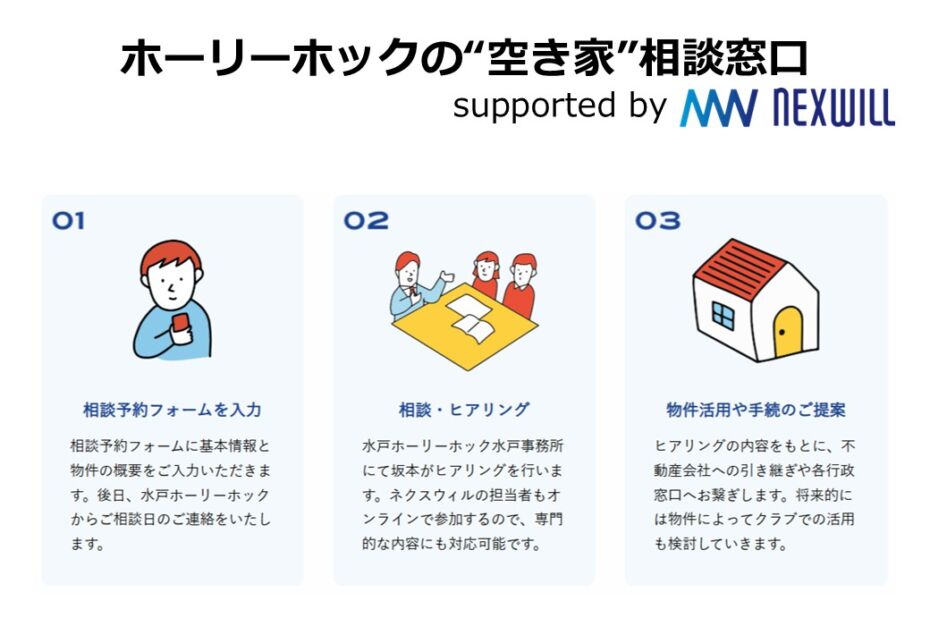 NEWS | 2025.04.15 水戸ホーリーホック×ネクスウィル「空き家相談窓口」開設のお知らせ この度、弊社はJリーグクラブ水戸ホーリーホックと連携し、 「ホーリーホックの“空き家”相談窓口」を開設することをお知らせいたします。 水戸ホーリーホック公式WEBサイト上に、相談窓口の特設ページを開設し、 クラブスタッフが一次窓口としての役割を担います。 またファン・サポーターの皆さまだけでなく、地域全体へ向けた啓蒙活動を行い、 一件でも多くの空き家が次の利用者につながること目指します。 特設ページはこちらから サービス開始予定日:2025年5月12日(月) プレスリリース: 水戸ホーリーホック ネクスウィル